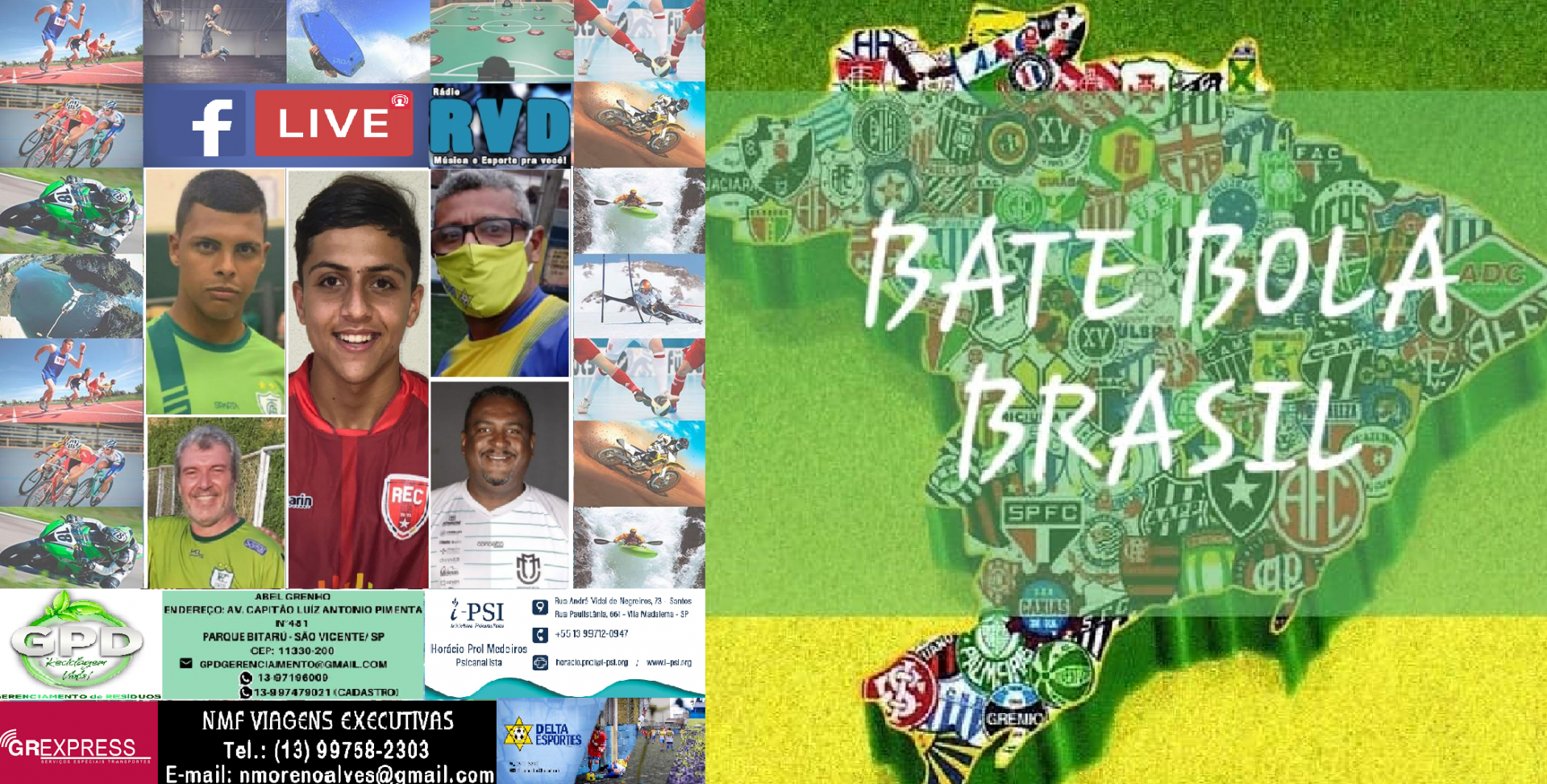 Sexta é dia de BBB - BATE BOLA BRASIL - na página da RÁDIO RVD no face. A partir das 19h50 o bate bola será com Yuri, goleiro do time sub 15 do América(MG); Matheus Soares, atacante do REC( Rolândia Esporte Clube(PR); Ailton, ex-jogador e proprietário da Arena Delta Esportes; Dinho, ex-jogador; e Jorge Luiz. o Buiu, treinador do time profissional do Maringá FC(PR). Contamos com a sua audiência.